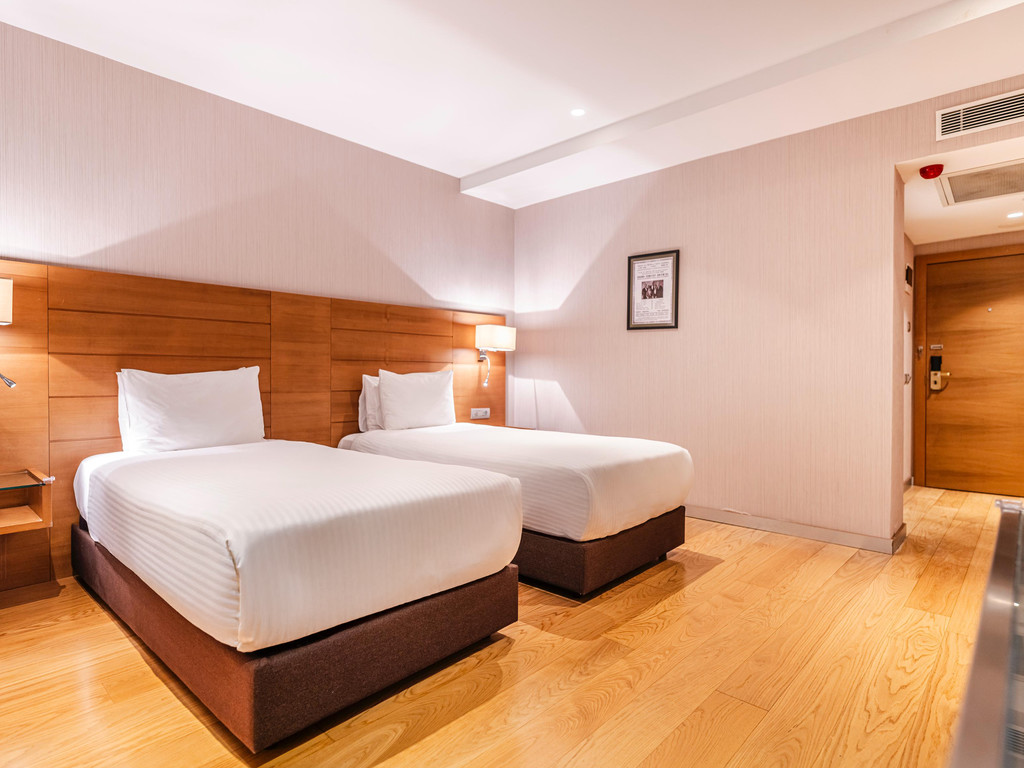 Rezervasyon Yap24 m² alanda yer alan bu zarif standart iki ayrı yataklı oda, hem konforu hem de şıklığı bir arada sunuyor. Modern tasarım ve fonksiyonel düzenlemelerle özenle dekore edilen oda, rahatlatıcı bir atmosfer yaratıyor. Parke zemin ve şık mobilyalar, her detayda huzurlu ve konforlu bir ortam sağlıyor. İki ayrı yatak, özellikle arkadaş grupları ya da iş seyahatinde olan misafirlerimiz için ideal ve rahat bir konaklama imkânı sunuyor. Geniş ve ferah alanı, teknolojik donanımları ve ergonomik düzeniyle her ihtiyaca hitap eden bu oda, hem rahat hem de verimli bir konaklama deneyimi yaşamanız için tasarlandı. Ayrıca bu oda tipinde, engelli misafirlerimizin kullanımına uygun 1 adet oda seçeneği bulunmaktadır.